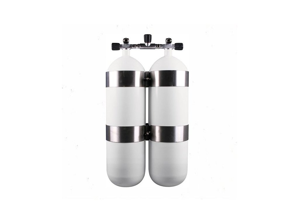 Kompletní sestava dvojče 2x15 L (300 bar) s manifoldem a ocelovými skružemi.