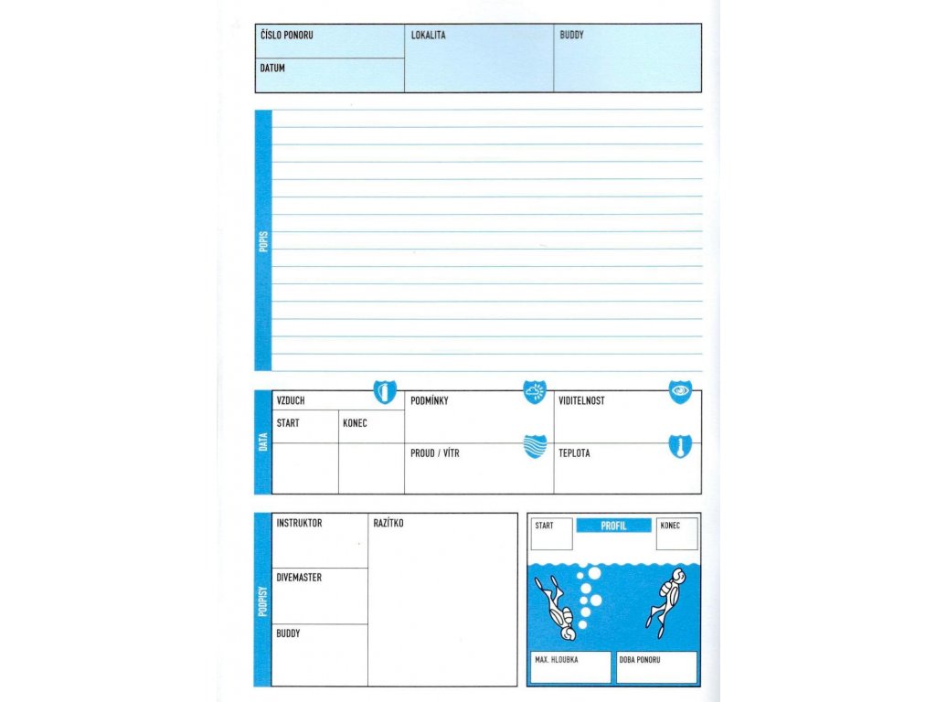 Papírový logbook pro zapisování vašich ponorů. Každá stránka je pro jeden ponor.
