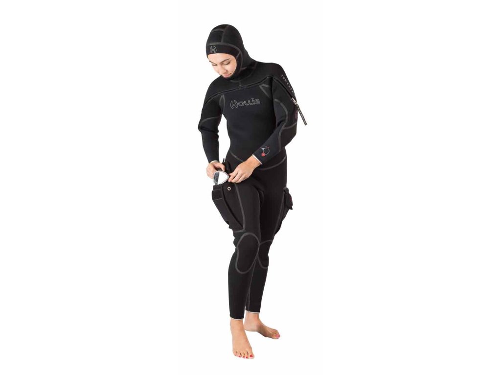 Oblek má integrovanou haubnu, což opět zvyšuje tepelný komfort. Jako další pomocník proti protékání vody je použita exkluzivní manžeta z thermalskinu, která se přetáhne přes hlavu a tím zabraňuje protékání vody v oblasti krku směrem dolů.
